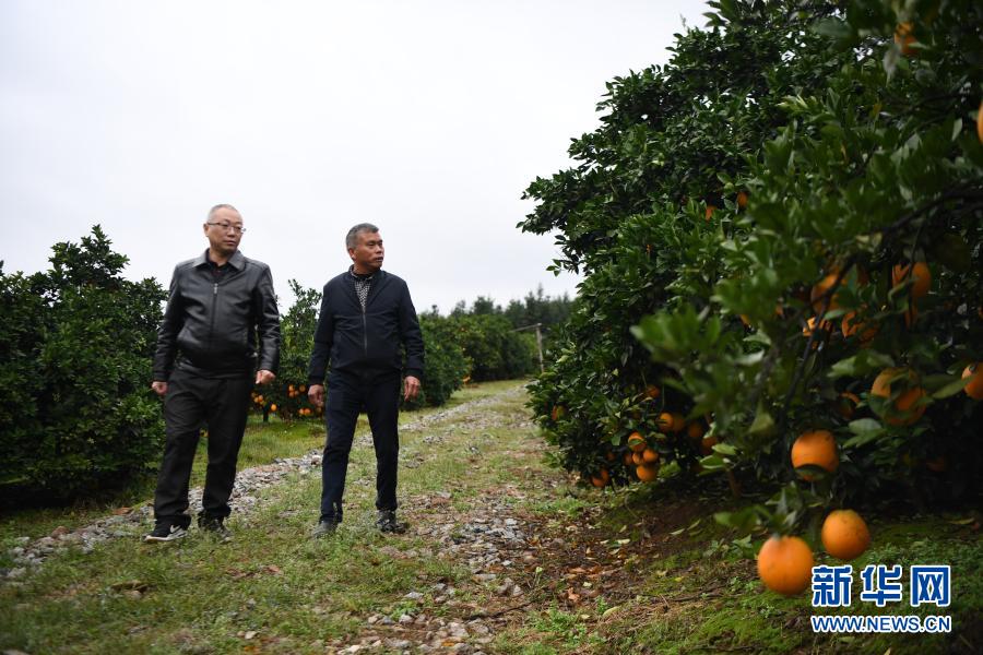 彭小刚(左)和江小平行走在石冲村的脐橙种植基地里(12月3日摄)。湖南省株洲市茶陵县石冲村地处山区,今年44岁的彭小刚是驻村扶贫工作队长,今年56岁的江小平是村支书。两人带领村民大力发展脐橙产业,彭小刚出点子,江小平抓落实,努力提升脐橙品质,扩大脐橙销量。今年,全村脐橙产值预计将超过500万元。