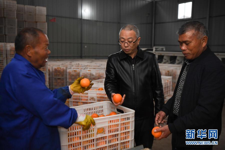彭小刚(中)和江小平(右)在石冲脐橙种植农民专业合作社的选果厂查看脐橙选果情况(12月3日摄)。湖南省株洲市茶陵县石冲村地处山区,今年44岁的彭小刚是驻村扶贫工作队长,今年56岁的江小平是村支书。两人带领村民大力发展脐橙产业,彭小刚出点子,江小平抓落实,努力提升脐橙品质,扩大脐橙销量。今年,全村脐橙产值预计将超过500万元。