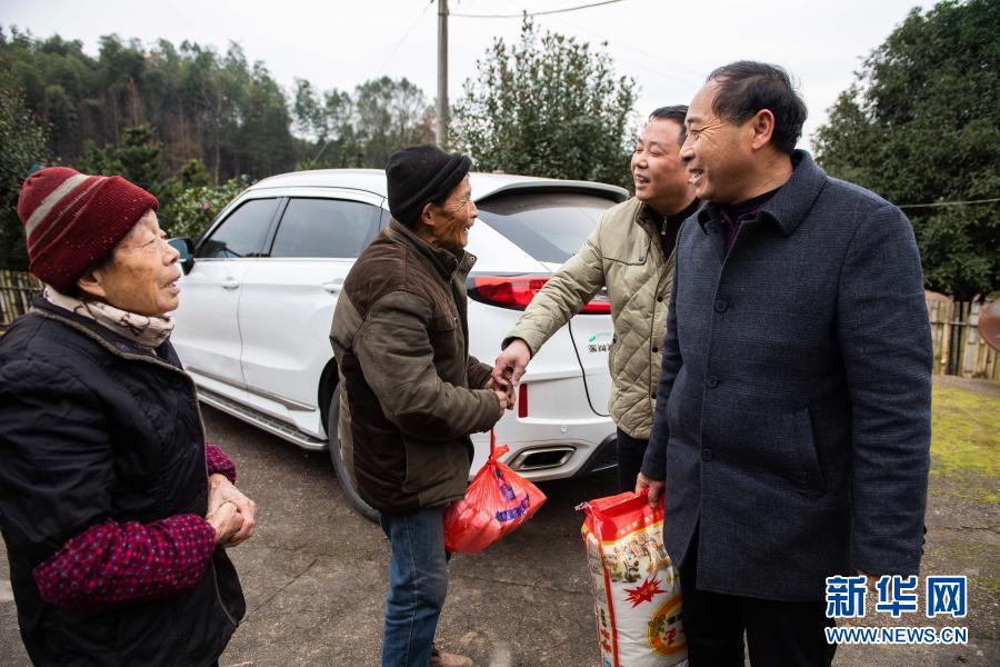 12月16日,朱建国(右一)和陈学林(右二)看望脱贫户。在湖南省常德市鼎城区黄土店镇红岩嘴村,有这样一对搭档——他们一个是从湖南湘潭来的“外地队长”陈学林,一个是土生土长的“本土支书”朱建国。2019年5月陈学林初来红岩嘴村时,村子在交通、饮水、用电等方面有诸多不便。这对搭档便一个跑外,一个管内。之前在市扶贫办工作的陈学林尽力为村里争取更多的扶贫项目资金,朱建国则用自己丰富的基层工作经验,为贫困群众解决实际困难。现在的红岩嘴村修路、改水、兴办产业,全村109户贫困户395人已全部实现脱贫摘帽。
