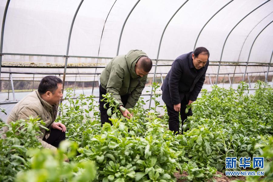 12月16日,朱建国(右)、陈学林(左)与村民一起查看大棚蔬菜长势。在湖南省常德市鼎城区黄土店镇红岩嘴村,有这样一对搭档——他们一个是从湖南湘潭来的“外地队长”陈学林,一个是土生土长的“本土支书”朱建国。2019年5月陈学林初来红岩嘴村时,村子在交通、饮水、用电等方面有诸多不便。这对搭档便一个跑外,一个管内。之前在市扶贫办工作的陈学林尽力为村里争取更多的扶贫项目资金,朱建国则用自己丰富的基层工作经验,为贫困群众解决实际困难。现在的红岩嘴村修路、改水、兴办产业,全村109户贫困户395人已全部实现脱贫摘帽。