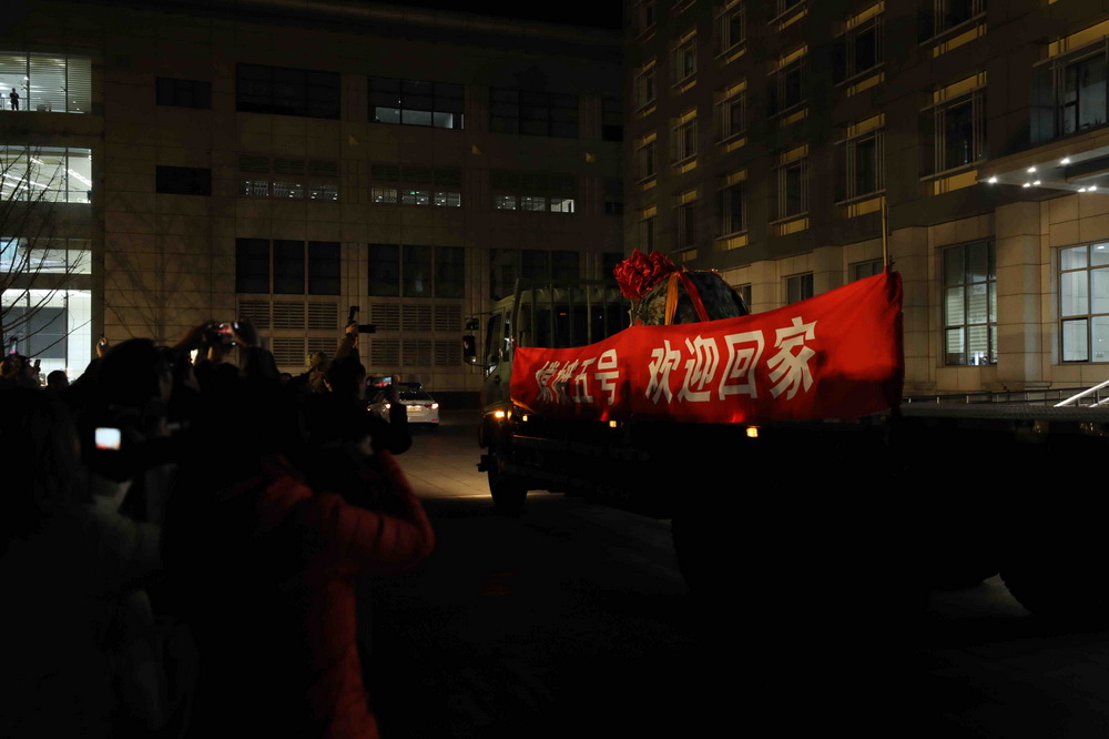 12月17日,在北京中国航天科技集团五院,人们在欢迎嫦娥五号返回器回到出生地。
