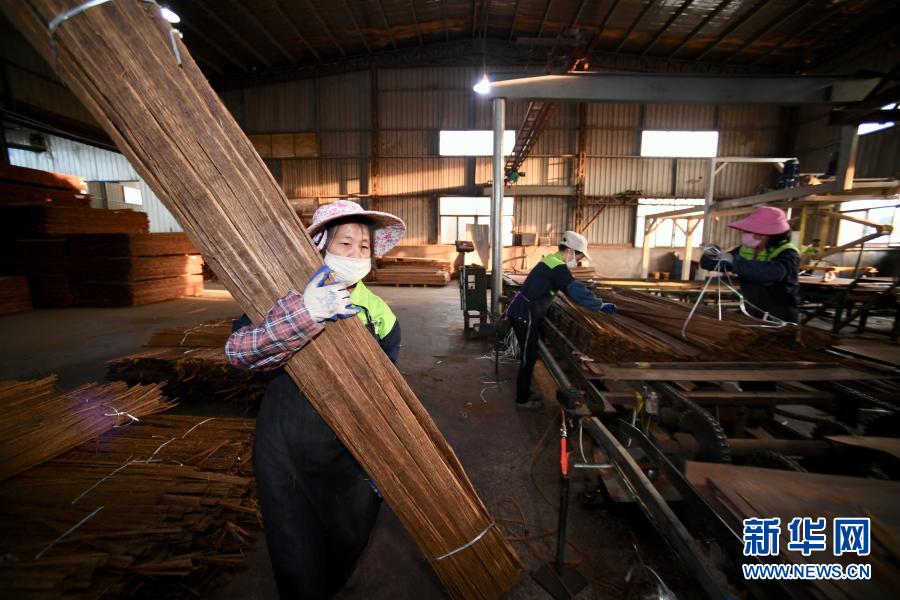 位于福建三明永安市洪田镇的福建省有竹科技有限公司员工在生产竹板材产品(11月26日摄)。