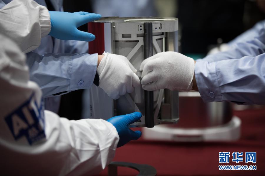12月17日,在中国航天科技集团五院,科研人员打开嫦娥五号返回器舱门,取出装有月球样品的容器并进行称重。