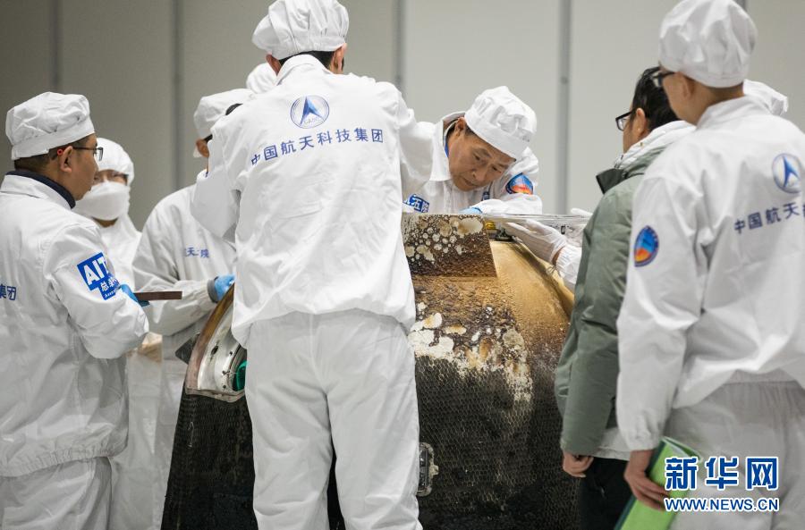 12月17日,在中国航天科技集团五院,科研人员打开嫦娥五号返回器舱门,取出装有月球样品的容器并进行称重。