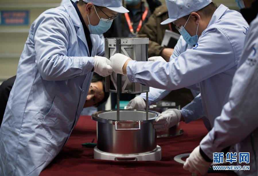 12月17日,在中国航天科技集团五院,科研人员打开嫦娥五号返回器舱门,取出装有月球样品的容器并进行称重。