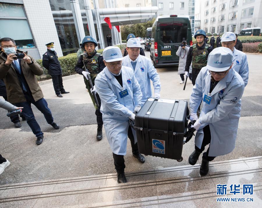 12月19日,在中国科学院国家天文台,工作人员将装有嫦娥五号任务月球样品的箱子搬进交接仪式现场。
