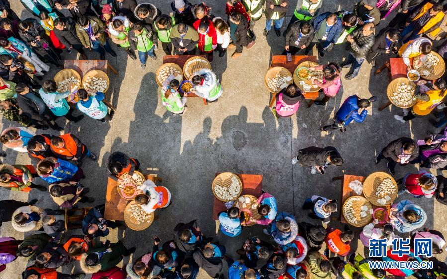 12月20日,秭归县九畹溪镇农民在该镇石柱村参加包饺子比赛(无人机照片)。