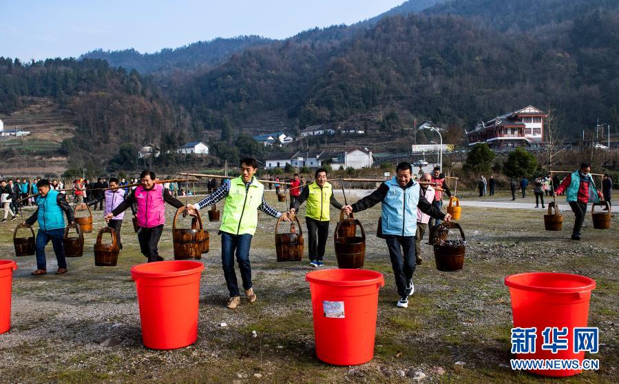 冬季农闲,湖北省秭归县九畹溪镇组织当地农民参加挑水、拔河、搓玉米、包饺子等丰富多彩的活动,庆祝丰收,喜迎新年。
