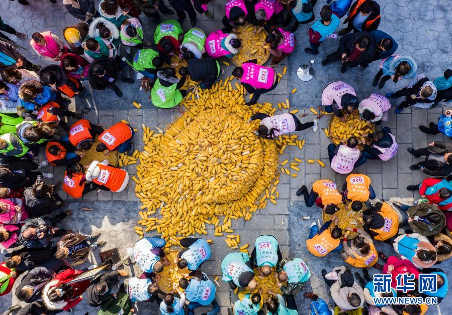 12月20日,秭归县九畹溪镇农民在该镇石柱村参加搓玉米比赛(无人机照片)。