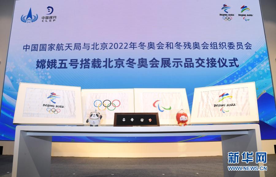 当日,中国国家航天局与北京2022年冬奥会和冬残奥会组织委员会嫦娥五号搭载北京冬奥会展示品交接仪式在北京冬奥组委首钢办公区举行。