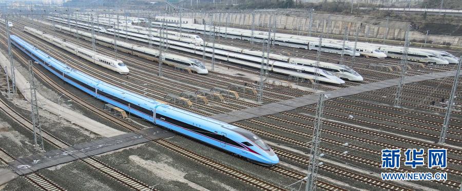 12月21日,“复兴号”CR300AF型动车在贵阳动车所内运行(无人机照片)。