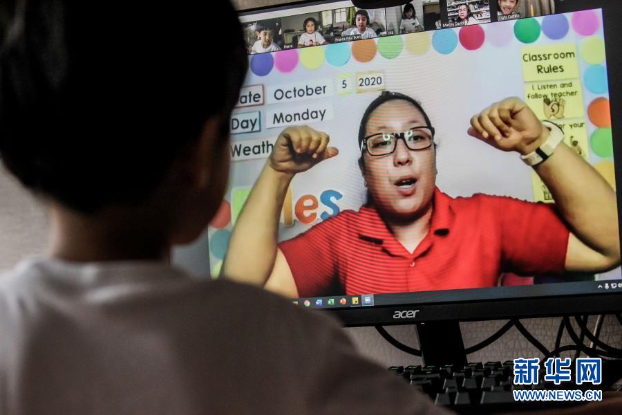 10月5日,在菲律宾马尼拉,5岁的格雷森·卢卡斯开学第一天上网课。为应对新冠疫情,菲律宾开学后通过线上平台网络教学。