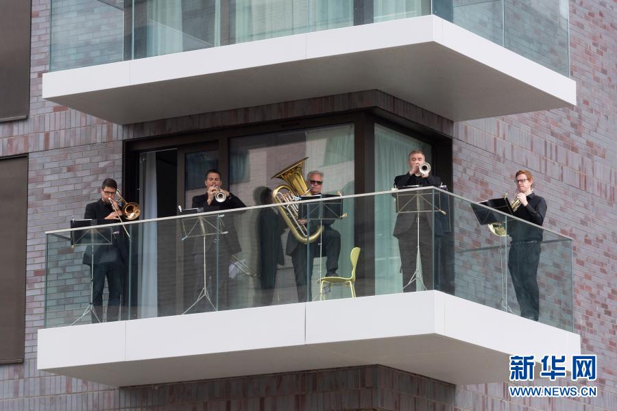 9月5日,在英国伦敦温布利公园布雷顿楼阳台上,英国皇家爱乐乐团成员在演奏,为附近街区的居民和参观者带来一场精彩演出。为保持社交距离,乐团成员以小乐团的形式在户外为人们演奏音乐。