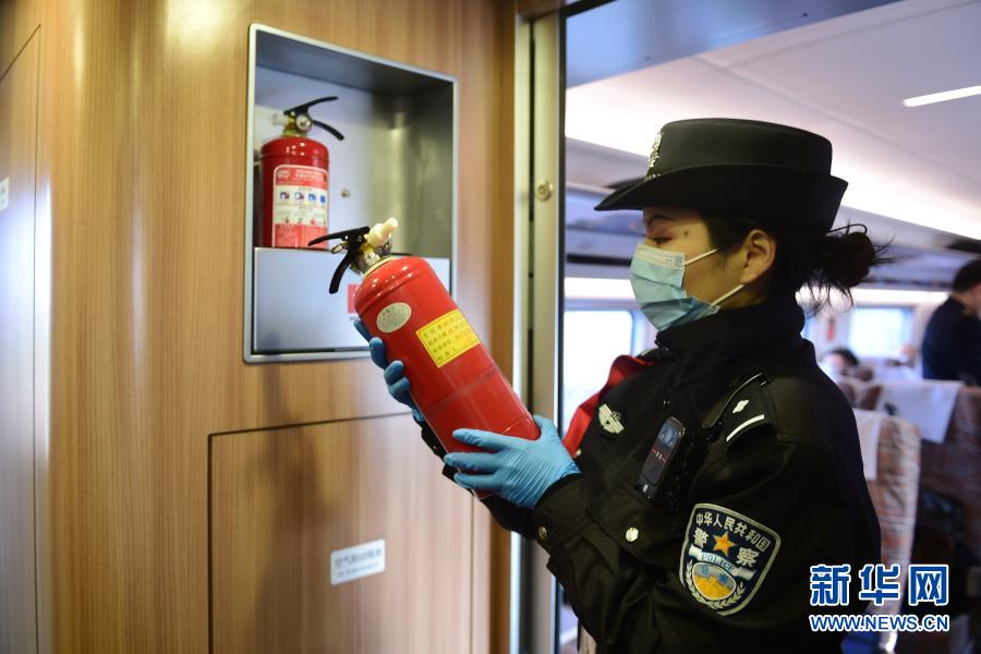 12月22日,合肥铁路公安处乘警在合肥南开往安庆的G8311次列车上检查消防设施。