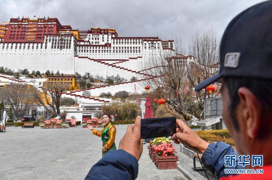 3月1日,西藏布达拉宫管理处讲解员次仁卓嘎(左)在进行直播。新华社记者 晋美多吉 摄