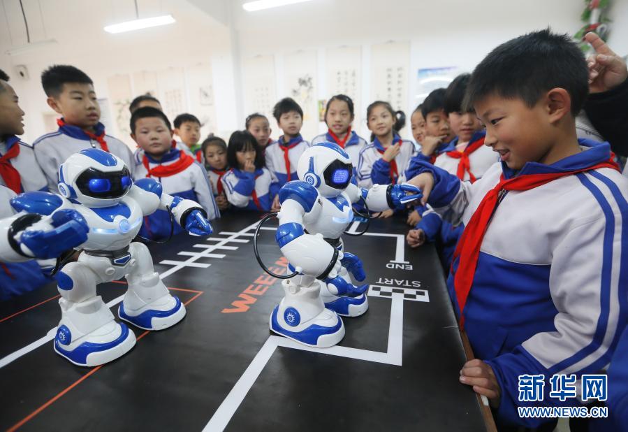 12月22日,大信普东小学学生在科技课上与机器人对话。