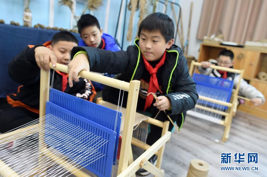 12月22日,浣纱小学五年级学生在用苎麻线织布。