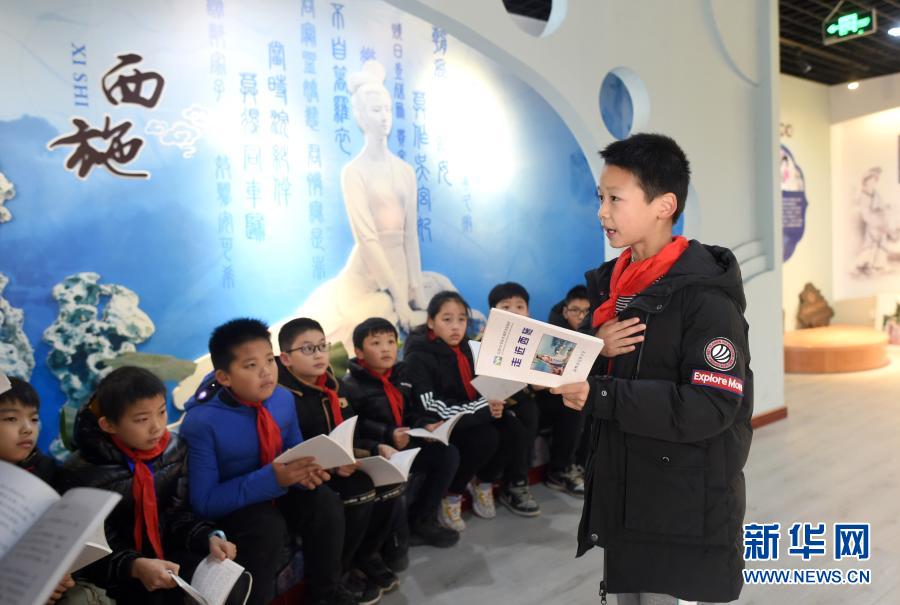 12月22日,浣纱小学五年级学生楼治罕(前)在西施故事传讲社团活动中为同学讲述“西施传说”。