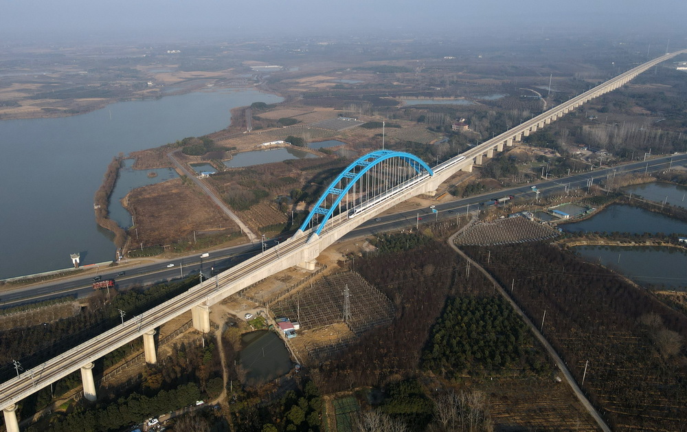 一列高铁列车经过安徽肥西花岗特大桥(12月22日摄,无人机照片)。新华社记者刘军喜摄