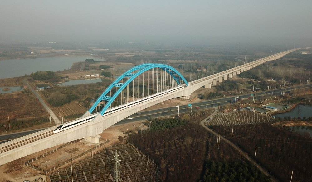 一列高铁列车经过安徽肥西花岗特大桥(12月22日摄,无人机照片)。新华社记者刘军喜摄