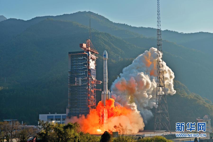 我国在西昌卫星发射中心用长征三号乙运载火箭(及配套远征一号上面级),以“一箭双星”方式成功发射第50、51颗北斗导航卫星(2019年11月23日摄)。新华社发(郭文彬 摄)
