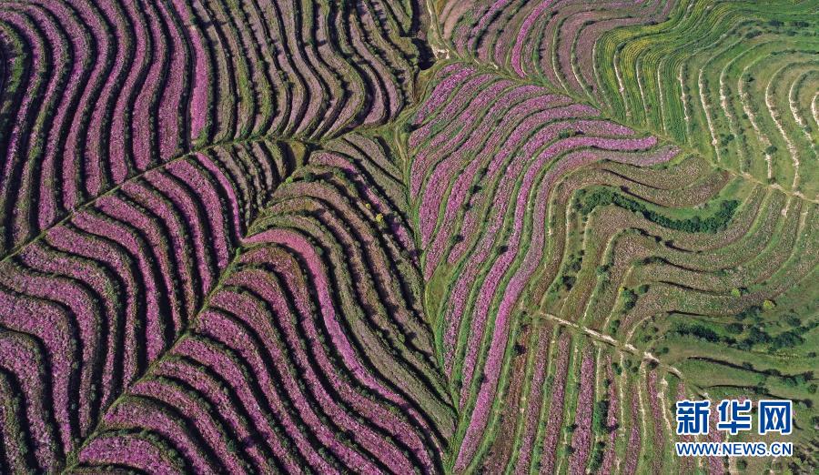 宁夏固原市西吉县吉强镇马营村的梯田(9月10日摄,无人机照片)。2020年11月16日,宁夏回族自治区政府宣布固原市西吉县退出贫困县序列,往昔干旱贫瘠已远去,今朝五彩斑斓入画来。