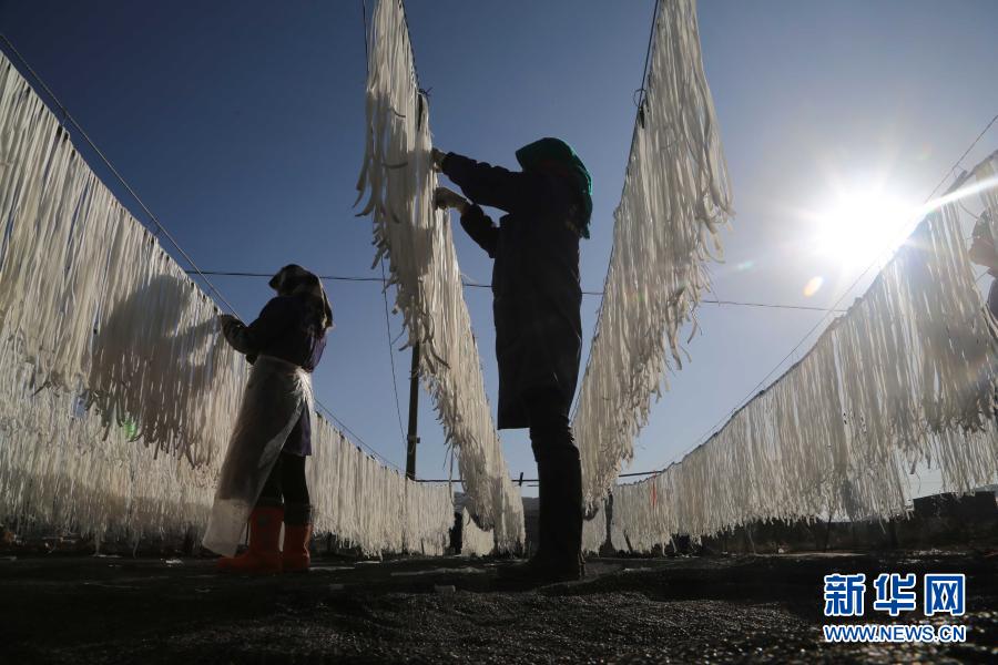 12月23日,甘肃省定西市安定区宁远镇红土村的村民在晾晒粉条。