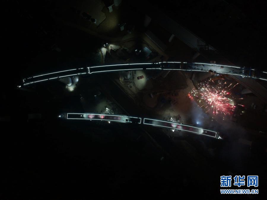 12月25日凌晨,常益长铁路“动走右线2号特大桥连续梁”(下方短桥)完成转体(无人机照片)。