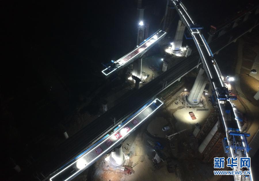 12月24日晚拍摄的即将实施转体的常益长铁路“动走右线2号特大桥连续梁”(左侧桥)及已经完成转体的“动走左线特大桥连续梁”(右侧桥)(无人机照片)。新华社记者 赵众志 摄