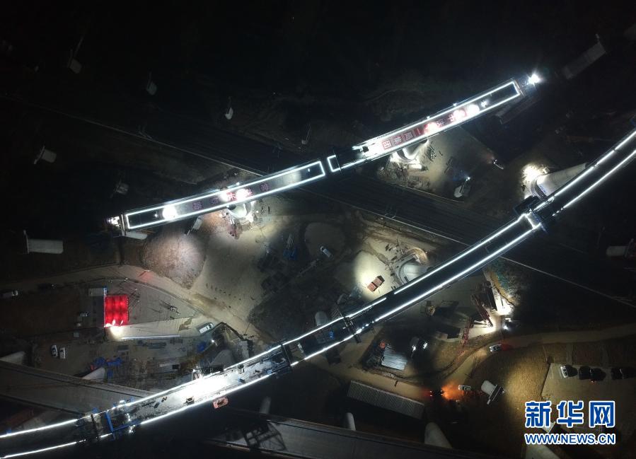 12月25日凌晨,常益长铁路“动走右线2号特大桥连续梁”(上方短桥)完成转体(无人机照片)。新华社记者 赵众志 摄