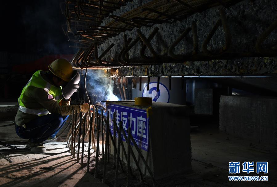 12月25日凌晨,转体后,工人对转体梁底座上下转盘进行固结焊接施工。新华社记者 赵众志 摄