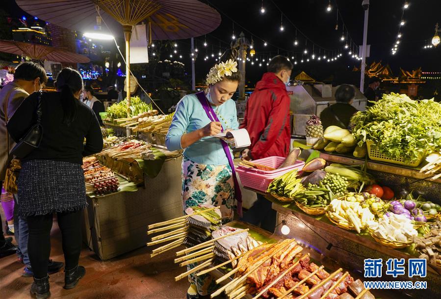 12月25日,一名摊主在摊位上忙碌。 云南省西双版纳傣族自治州景洪市的星光夜市邻近澜沧江,汇集了特色小吃、民族手工艺品、文创产品等,吸引众多游客的到来。 新华社发(陈欣波 摄)