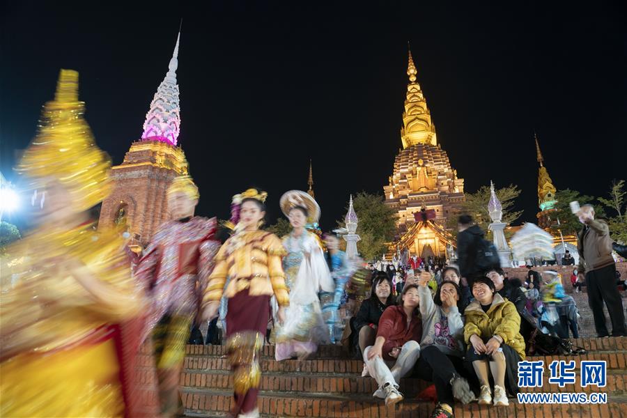 12月25日,游客在星光夜市上合影。 云南省西双版纳傣族自治州景洪市的星光夜市邻近澜沧江,汇集了特色小吃、民族手工艺品、文创产品等,吸引众多游客的到来。 新华社发(陈欣波 摄)