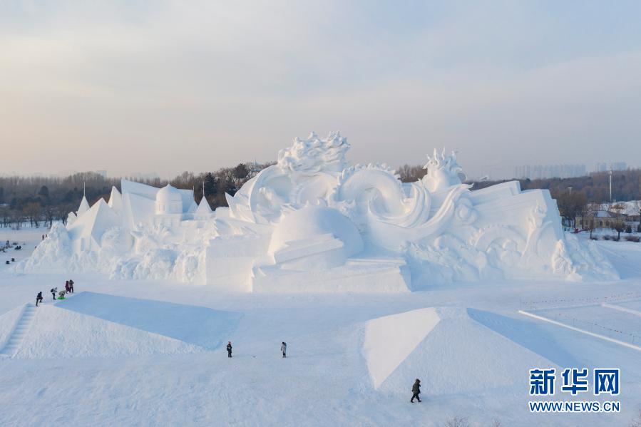 12月25日拍摄的本届“雪博会”主塑《华夏神龙》,长116米,高33米,用雪量达3.5万立方米(无人机照片)。