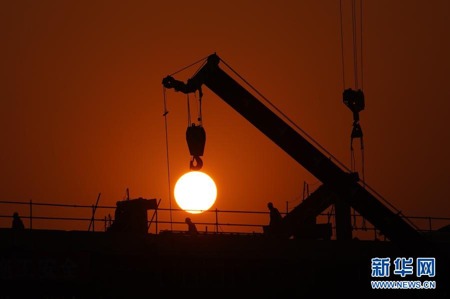 12月26日日出时分,中铁十二局的工人在雄安站施工。新华社记者 邢广利 摄