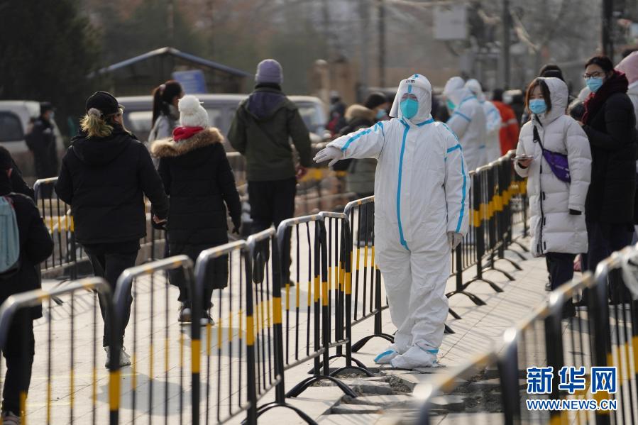 12月26日,在北京市朝阳区望京街道一处核酸采样点,工作人员在引导相关人员排队进行核酸采样。