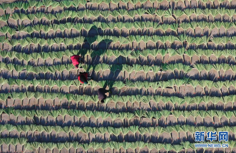 12月26日,乐亭县毛庄镇合元笤帚专业合作社员工在晾晒笤帚(无人机照片)。