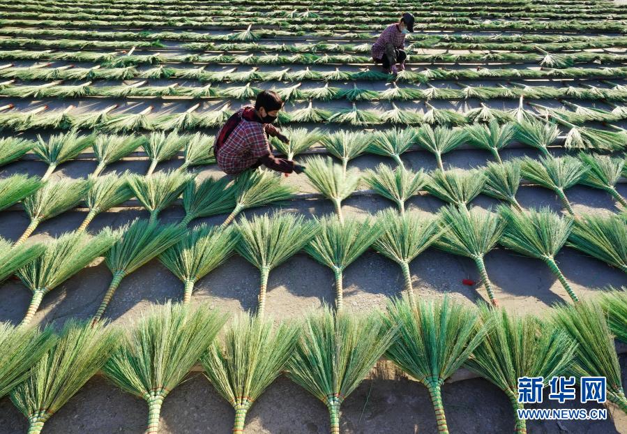 12月26日,乐亭县毛庄镇合元笤帚专业合作社员工在晾晒笤帚。新华社记者 杨世尧 摄
