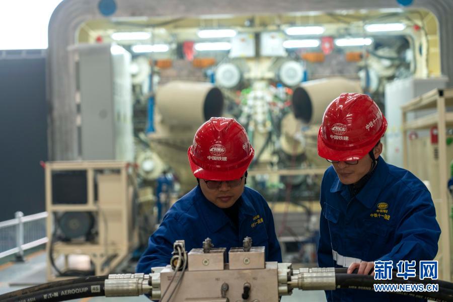 12月26日,中铁十一局两名技术人员为一台大型盾构机的后背顶进系统做检查。新华社记者 杜华举 摄