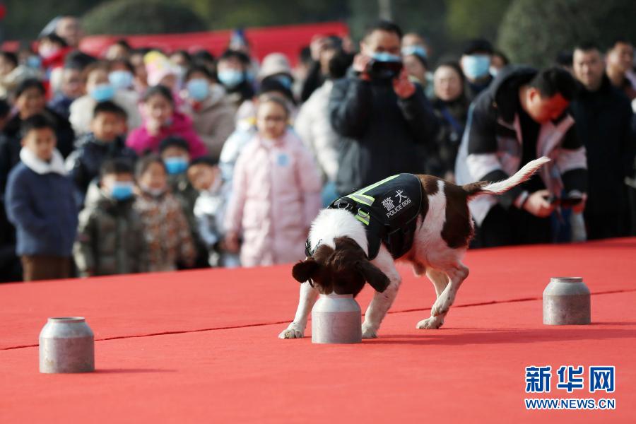 12月26日,淮北市公安局的警犬在演示查缉搜毒。新华社发(万善朝 摄)