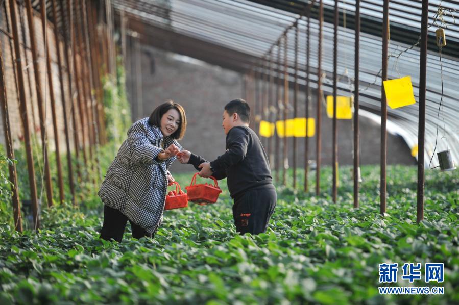 12月26日,在承德市双滦区偏桥子镇一处草莓采摘园,游客在采摘草莓。新华社发(王立群 摄)