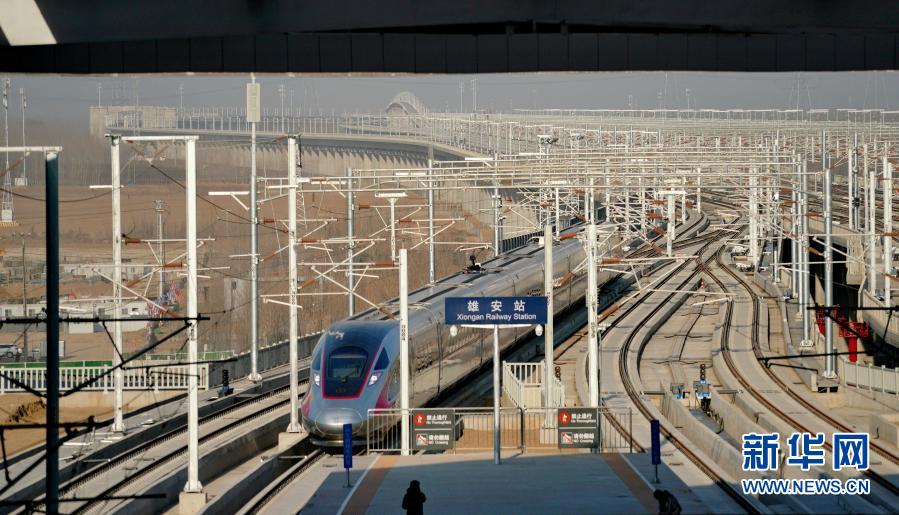 12月24日,用于测试的动车组列车驶离京雄城际铁路雄安站。新华社记者 牟宇 摄