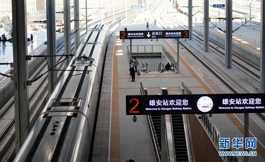 12月24日,用于测试的动车组列车驶离京雄城际铁路雄安站。新华社记者 牟宇 摄