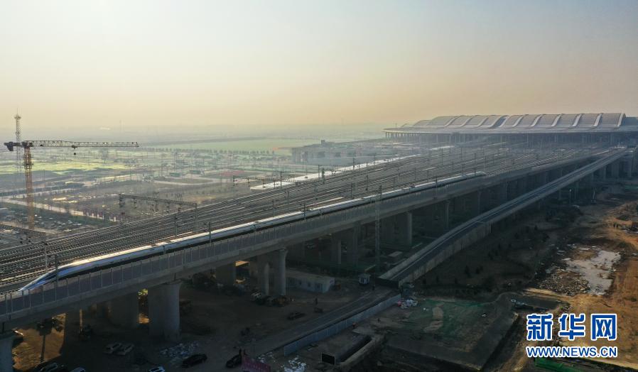12月27日,从雄安开往北京西的首发列车驶离雄安站(无人机照片)。当日,北京至雄安新区城际铁路大兴机场至雄安新区段开通运营,京雄城际铁路实现全线贯通,雄安站同步投入使用。新华社记者 牟宇 摄