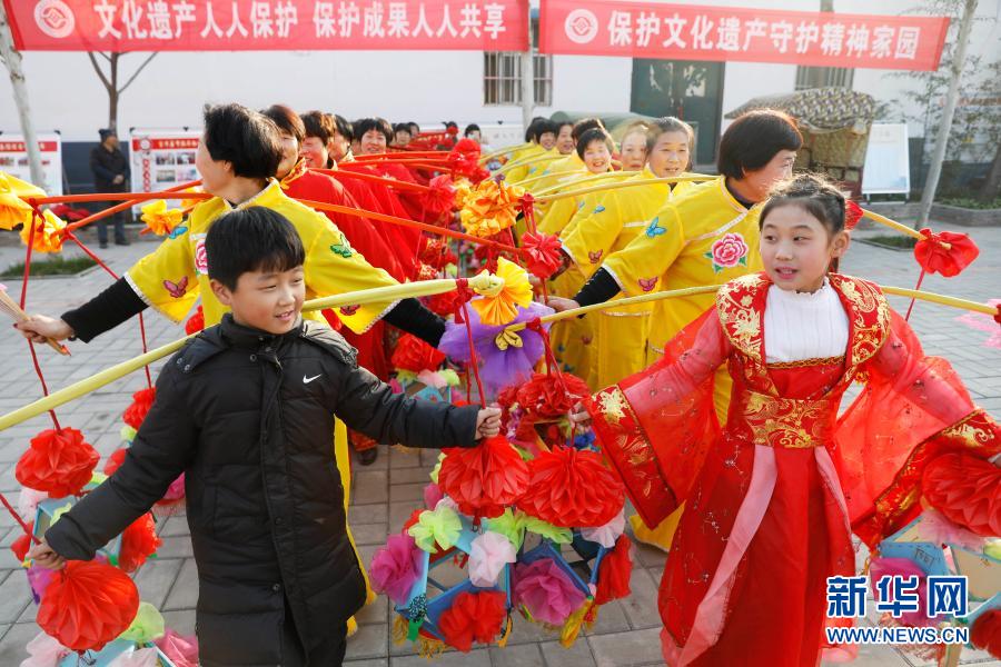 12月27日,小学生在河南省平顶山市宝丰县张八桥镇姚店铺村跟民间艺人一起表演非遗经担舞。