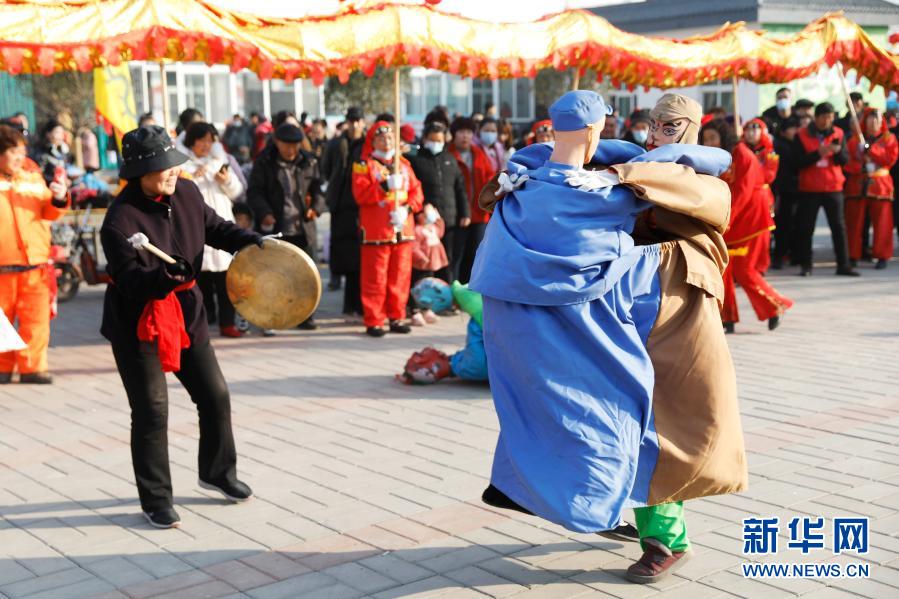 12月27日,在河南省平顶山市宝丰县张八桥镇姚店铺村,民间艺人表演非遗“二鬼摔跤”。