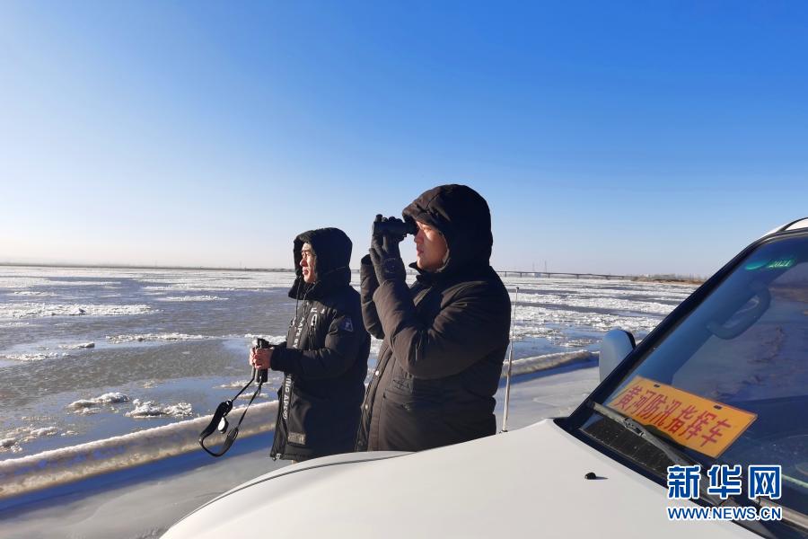 12月24日,巡测队队员在磴口黄河大桥附近观测流凌情况。