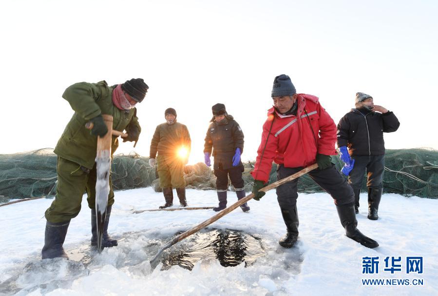 12月27日,渔工们在乌伦古湖凿开一个下网眼。