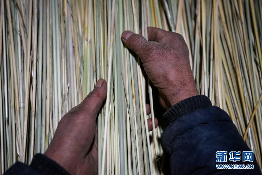 李耀梅在整理芨芨草,她的双手因为常年割草、扎扫帚布满了老茧(10月27日摄)。新华社记者 冯开华 摄