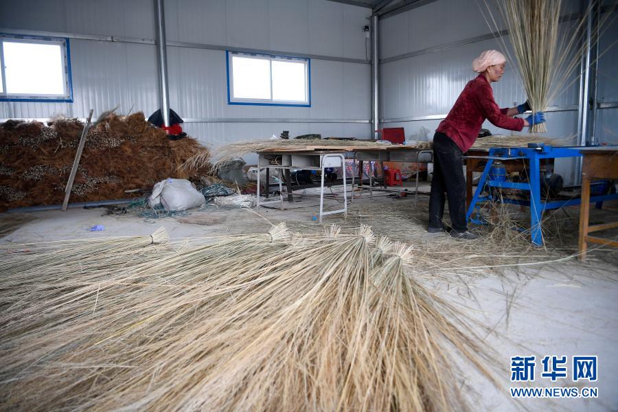 李耀梅在扶贫工厂用自己制作的机器扎制扫帚(10月26日摄)。新华社记者 杨植森 摄